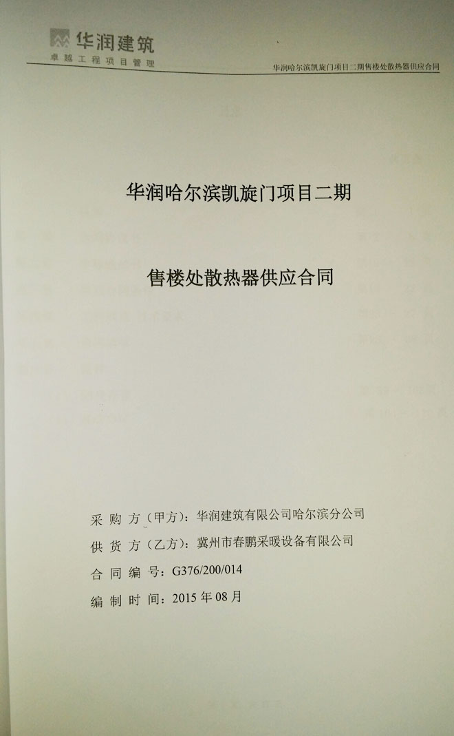 熱烈慶祝春鵬采暖和華潤建筑有限公司合作成功,河北冀州暖氣片生產廠家首選冀州春鵬,春鵬是2004年建成的冀州市春鵬散熱器廠,經過十余年的發展,現在是冀州市春鵬采暖設備有限公司。春鵬提供銅鋁暖氣片,鋼鋁暖氣片,內腔無砂灰鑄鐵暖氣片、鋼制翅片管、銅鋁復合、鋼鋁復合、衛浴鋼制柱型及地暖等百余種散熱器,銷售專線:133-1308-1167。